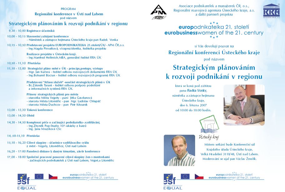 přijměte pozvání na tiskovou konferenci dne 6. března 2007 v době 13.00 - 13.30 hodin, pořádanou v rámci Regionální konference Ústeckého kraje pod názvem „Strategickým plánováním k rozvoji podnikání v regionu“. Konferenci pořádá Asociace podnikatelek a manažerek ČR, o.s. pod záštitou náměstka a zástupce hejtmana Radka Vonky v hlavním zasedacím sále budovy „A“ Krajského úřadu Ústeckého kraje (ul. Velká Hradební 48, Ústí nad Labem), 2. patro. V programu konference, začínající v 10.00 hodin, jsou mimo jiné zařazeny následující body: Představení projektu EUROPODNIKATELKA 21.století, Strategické plány měst v Ústeckém kraji nebo Komplexní péče o začínající podnikatelky – vzdělávání. Bližší informace podává za organizátory konference Milena Rychtářová, výkonná ředitelka APM ČR, o.s., tel: 602 615 793, e-mail: info@apmcr.cz.