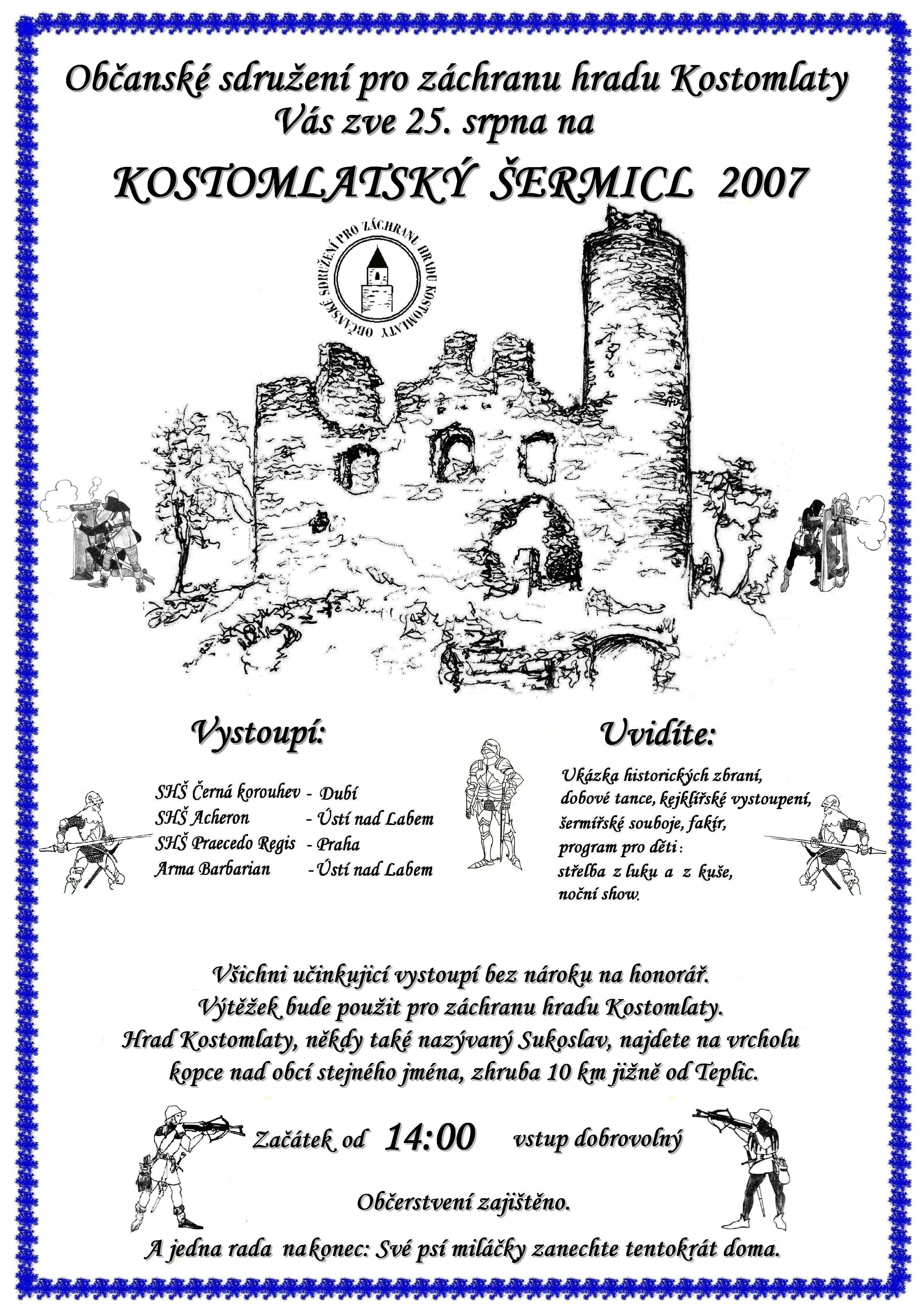 Zveme Vás na KOSTOMLATSKÝ ŠERMICL 2007 pořádaný Občanským sdružením pro záchranu hradu Kostomlaty dne 25. 8. 2007 na hradě Sukoslav.